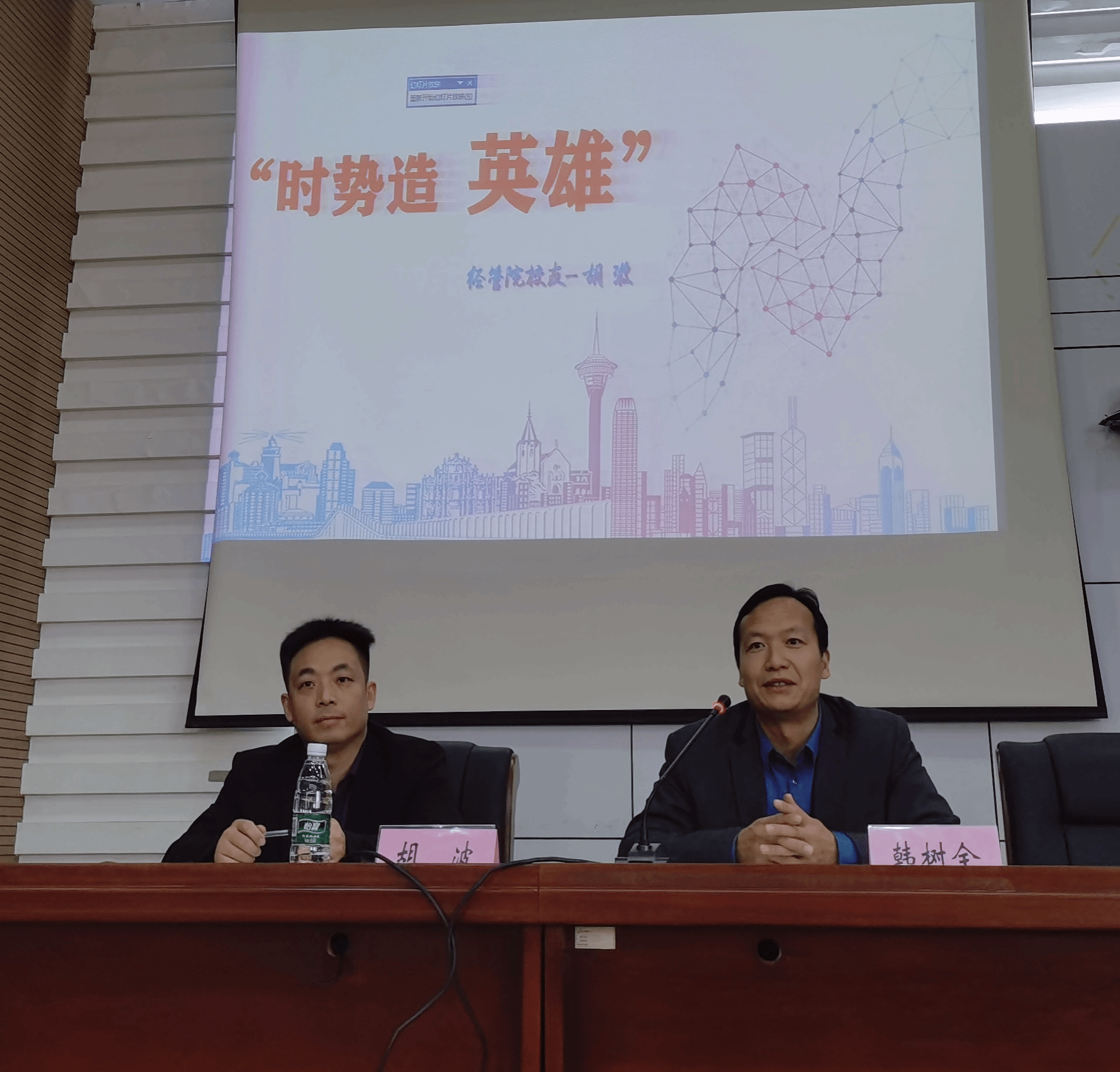 胡波紧扣“时势造英雄”讲座主题,以自身成长发展历程总结的十大经验分享开篇, 结合丰富的就业创业案例讲授了职场应练就的各种能力和创业过程中借力借势能力的培养与运用,实践指导性强。现场座无虚席,气氛活跃。